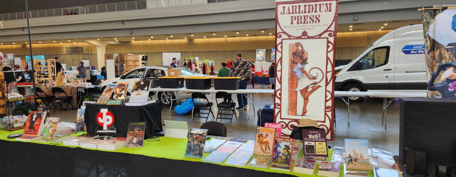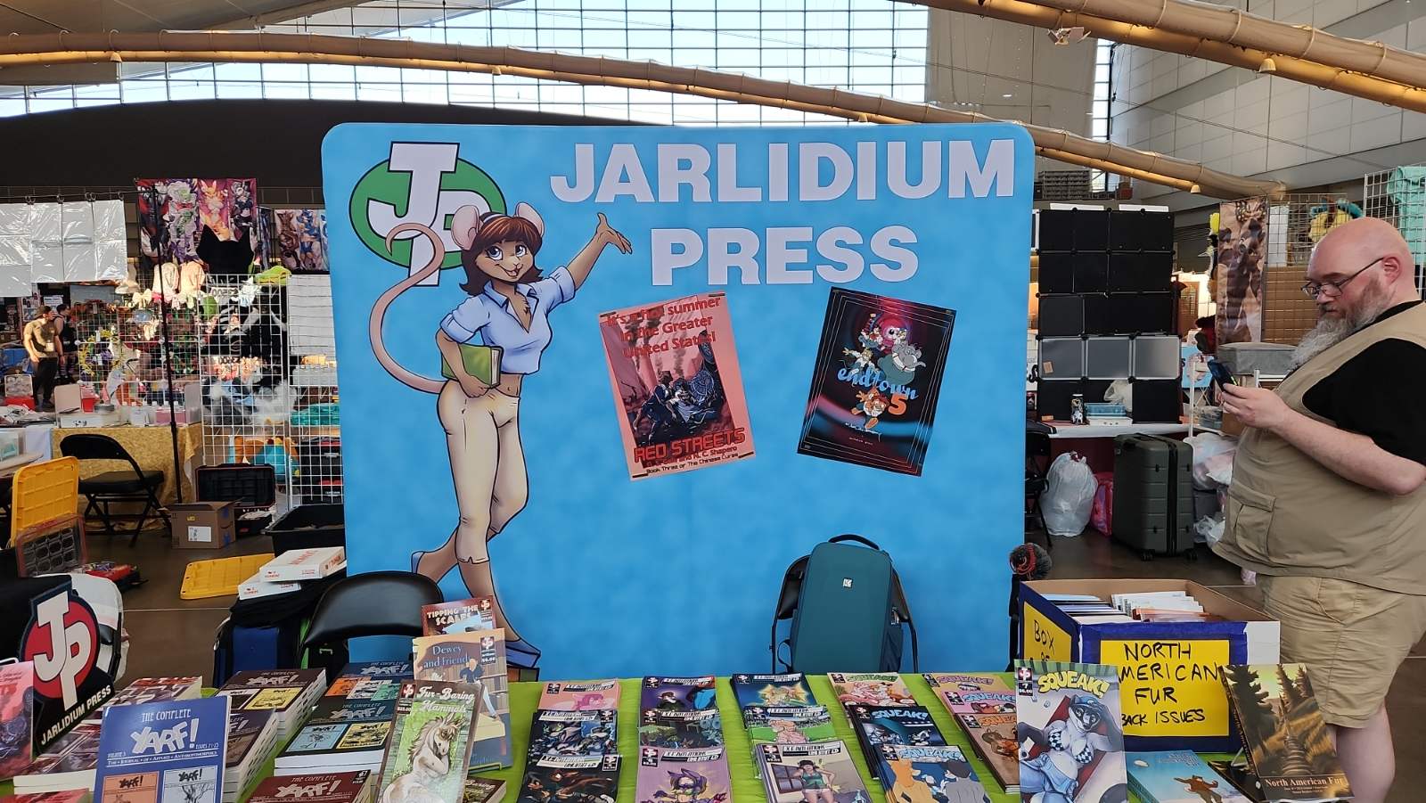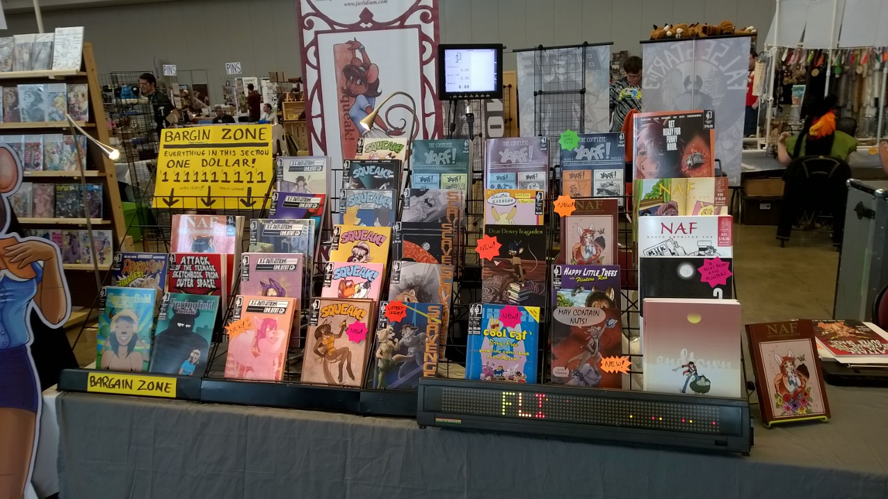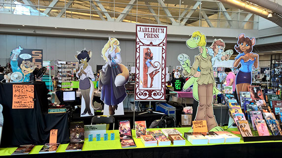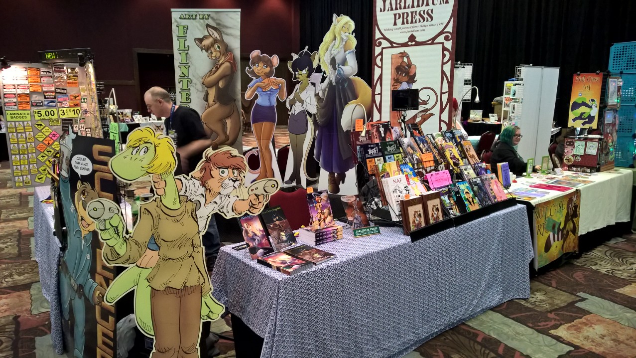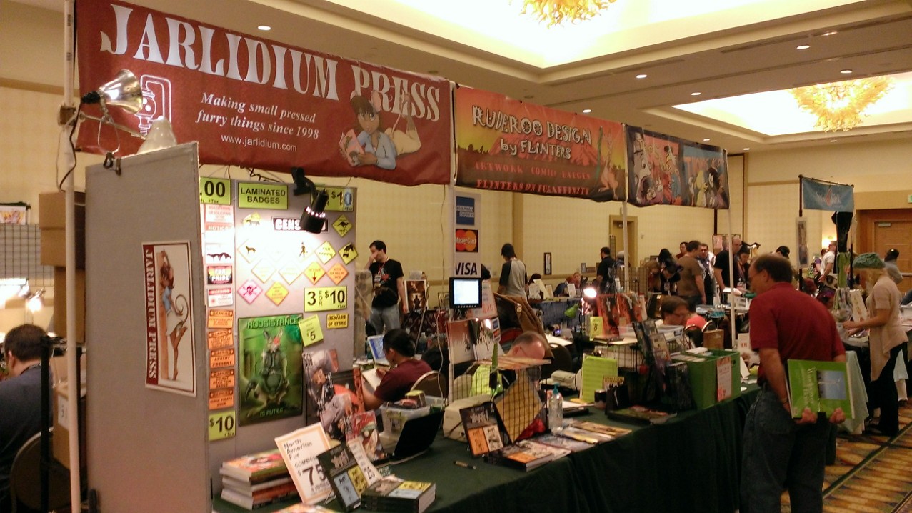 Hard to believe we've been doing this for more than 25 years, but I have a book with the Jarlidium name on it dated late 1998. A lot has changed since then! We started with fanzines printed on a photocopier, and now we're publishing full-color perfect-bound paperback books. Jarlidium Press consists of James "Tibo" Birdsall and Dan "Flinters" Canaan, and its history starts in the mid-90's, when Dan was doing fanzine publishing with the Unigraphix crew. He ended up on the west coast, separated from the rest of Unigraphix by the width of a continent, at about the same time that improved consumer-level color printing technology was eating away at Unigraphix's main business, which was doing fancy dye-sub color prints for various artists. The fanzine business was still going strong, so when Unigraphix proper folded, Dan had no reason to stop. James, who was stunned by the revelation that just anybody could publish a fanzine, was already starting to get into the act. Then we saw an ad for a secondhand Xerox copier... With the printing now literally in-house, our activity increased, and when we took over the monthly Dallas Brawl Update, the Jarlidium Press marque was born. Eventually, Xerox dropped support for our original copier and we leased a more recent unit, then moved over to a Canon digital copier. Since the Canon was both a high-speed sheet-fed scanner and a network printer as well as a copier, it gave us our first taste of doing production on the computer — we could scan the incoming art, do all the touchup and layout electronically, and then print the final product directly from the files. The rise of print-on-demand services on the Internet completed Jarlidium's transition to the purely electronic. When the lease for the Canon was up, we returned it and did not get a replacement. We can get a better product — professionally-printed paperback books and comics — by letting the specialists handle that part, and with the disappearance of homemade fanzines from the fandom, professional printing is what buyers expect these days. What's a fanzine? Back before the rise of big Internet art archives, the only way for art to get from artist to audience was on paper. There were professional publications, comics such as Furrlough or Genus or Zu or Critters, where the artist got paid, and then there were fanzines, where the artist didn't get paid but did get copies of the publication. Fanzines were generally digest sized, 5.5" by 8.5", the size you get if you fold a standard piece of copier paper in half, and were printed on copiers at the publisher's local copy shop. Some of the fancier ones were 8.5" by 11" and had colored cardstock covers. Fanzines used to be the mainstay of the fandom, and at their height there were several dozen active titles.