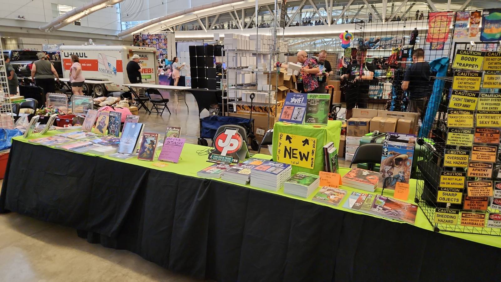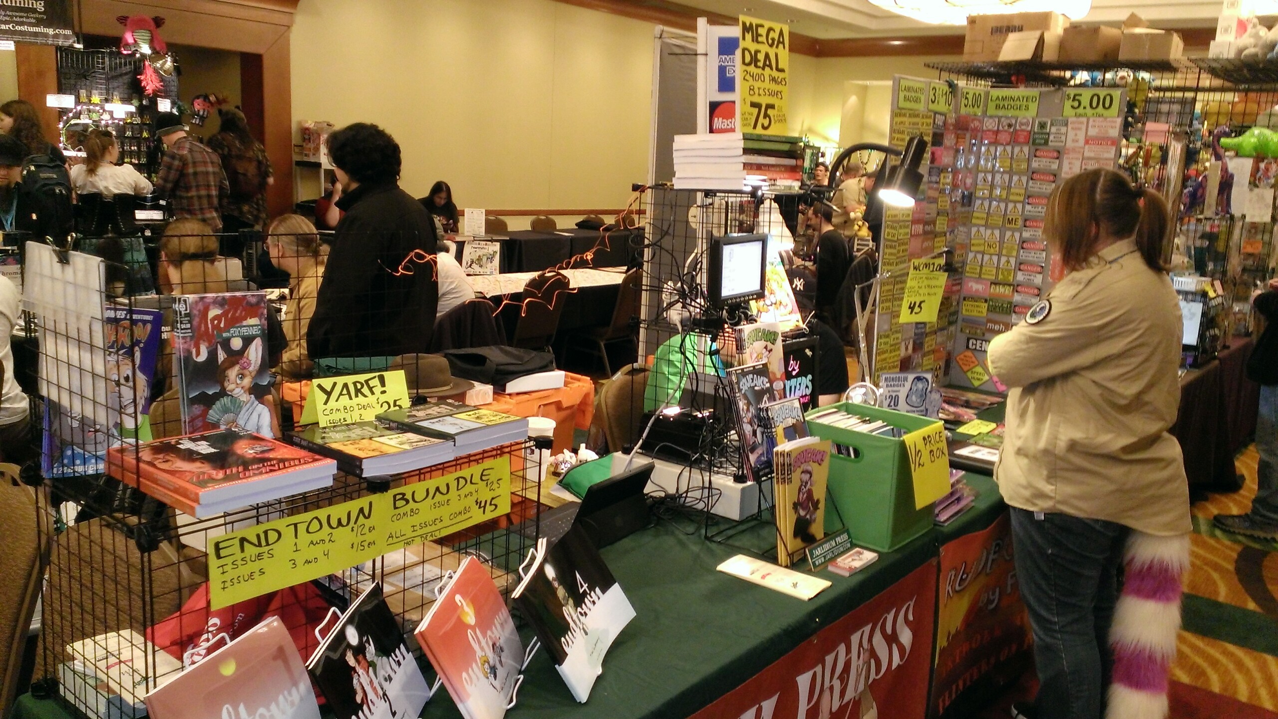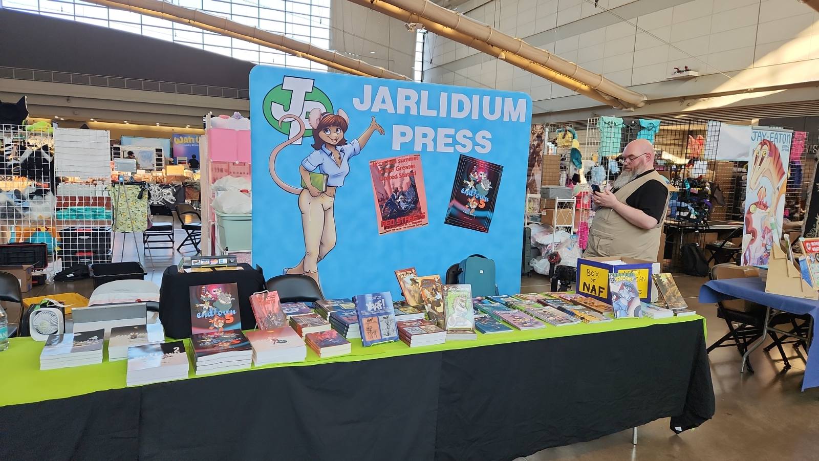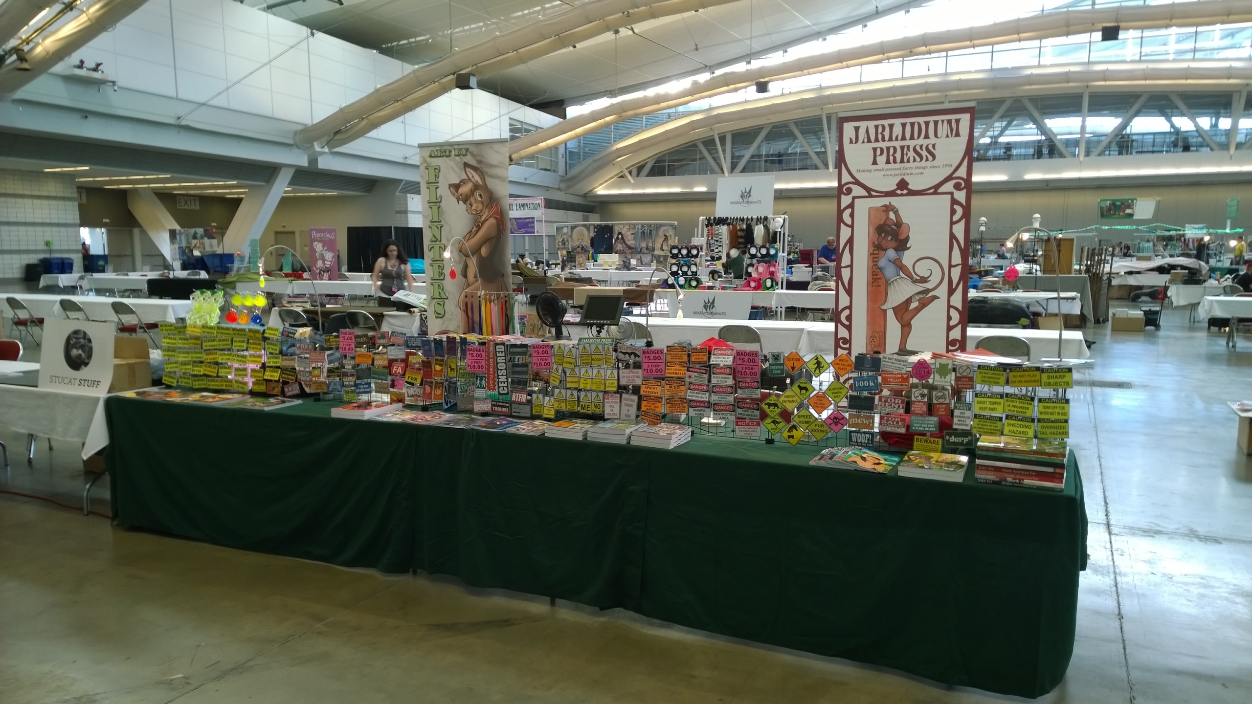 Hard to believe we've been doing this for more than 25 years, but I have a book with the Jarlidium name on it dated late 1998. A lot has changed since then! We started with fanzines printed on a photocopier, and now we're publishing full-color perfect-bound paperback books. Jarlidium Press consists of James "Tibo" Birdsall and Dan "Flinters" Canaan, and its history starts in the mid-90's, when Dan was doing fanzine publishing with the Unigraphix crew. He ended up on the west coast, separated from the rest of Unigraphix by the width of a continent, at about the same time that improved consumer-level color printing technology was eating away at Unigraphix's main business, which was doing fancy dye-sub color prints for various artists. The fanzine business was still going strong, so when Unigraphix proper folded, Dan had no reason to stop. James, who was stunned by the revelation that just anybody could publish a fanzine, was already starting to get into the act. Then we saw an ad for a secondhand Xerox copier... With the printing now literally in-house, our activity increased, and when we took over the monthly Dallas Brawl Update, the Jarlidium Press marque was born. Eventually, Xerox dropped support for our original copier and we leased a more recent unit, then moved over to a Canon digital copier. Since the Canon was both a high-speed sheet-fed scanner and a network printer as well as a copier, it gave us our first taste of doing production on the computer — we could scan the incoming art, do all the touchup and layout electronically, and then print the final product directly from the files. The rise of print-on-demand services on the Internet completed Jarlidium's transition to the purely electronic. When the lease for the Canon was up, we returned it and did not get a replacement. We can get a better product — professionally-printed paperback books and comics — by letting the specialists handle that part, and with the disappearance of homemade fanzines from the fandom, professional printing is what buyers expect these days. What's a fanzine? Back before the rise of big Internet art archives, the only way for art to get from artist to audience was on paper. There were professional publications, comics such as Furrlough or Genus or Zu or Critters, where the artist got paid, and then there were fanzines, where the artist didn't get paid but did get copies of the publication. Fanzines were generally digest sized, 5.5" by 8.5", the size you get if you fold a standard piece of copier paper in half, and were printed on copiers at the publisher's local copy shop. Some of the fancier ones were 8.5" by 11" and had colored cardstock covers. Fanzines used to be the mainstay of the fandom, and at their height there were several dozen active titles.